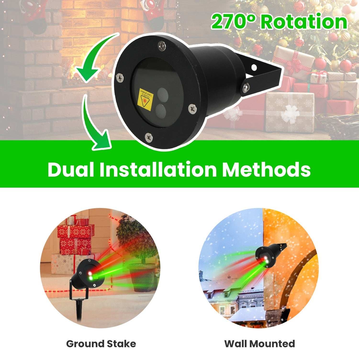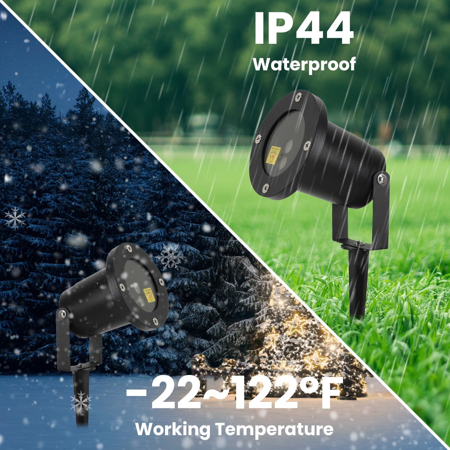 - * IP44 Waterproof Laser Light *: Thanks to outstanding IP44 waterproof rating and sturdy iron body,this outdoor projector laser light can withstand -22℉~122℉ temperature,perfectly work in various harsh weather conditions,like rain,snow or heat. You can either simply use screw to fix it on bracket and mount this laser light on wall,or insert it onto ground by stake. 270° Adjustable angle helps you precisely control lighting direction.