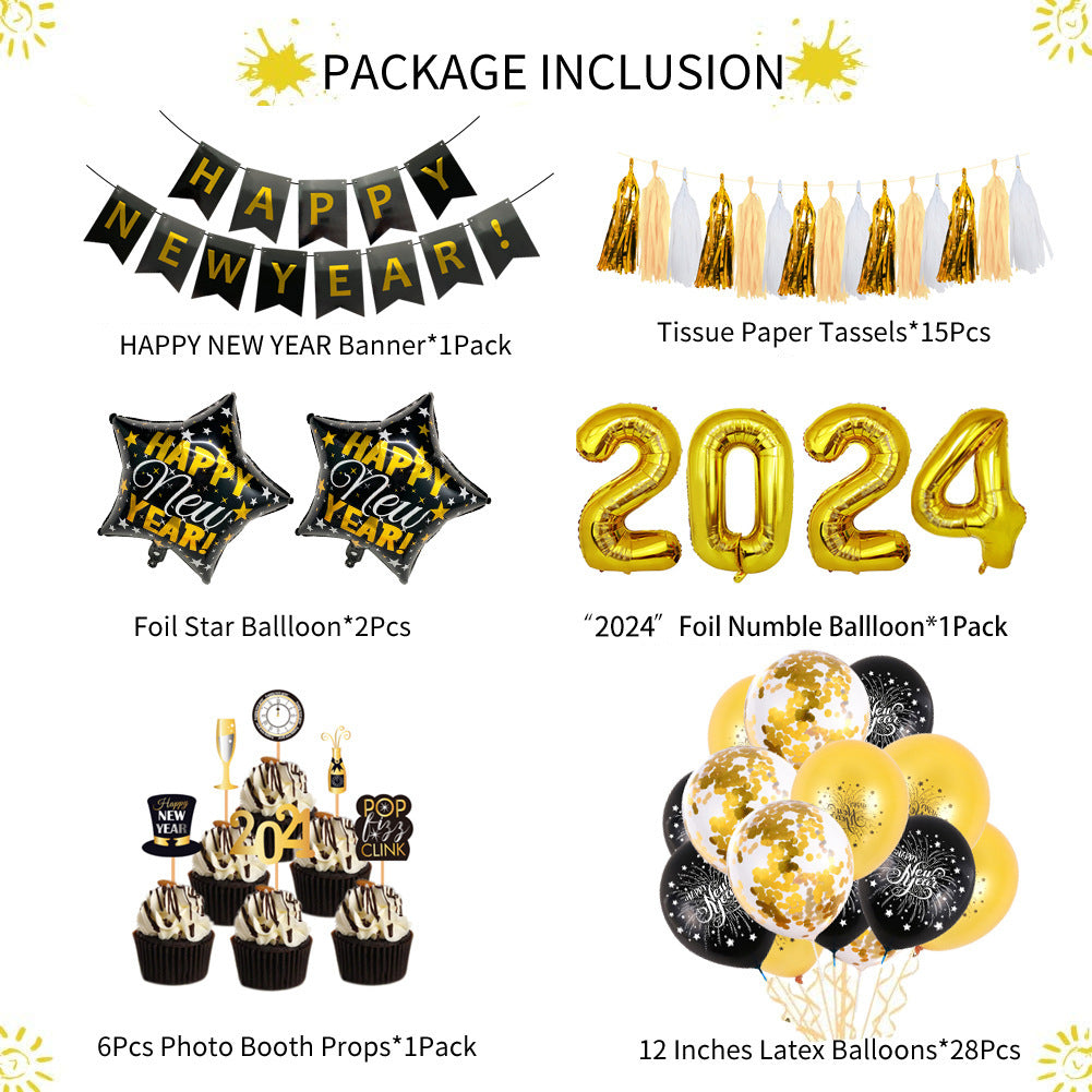 Balloon*34 New Year props*1 Set Pull flag*1 Set Tassel*3 Bag Tape*1 Ribbon*1 Straw*1