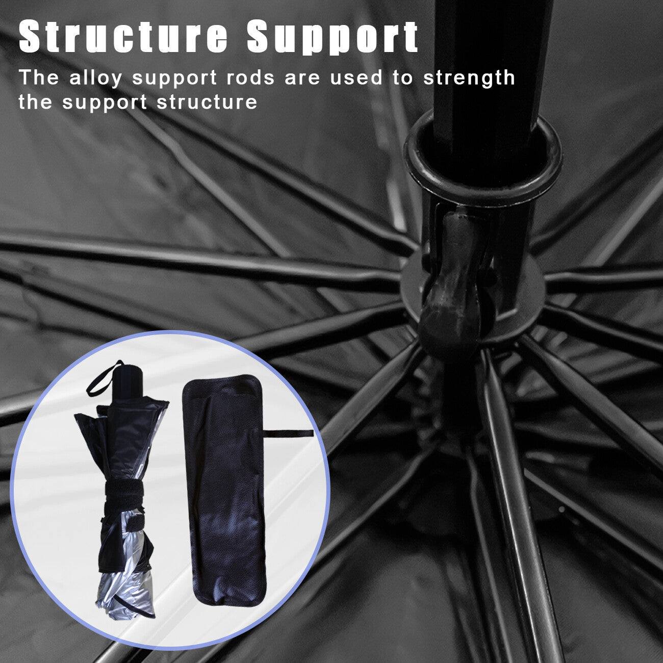 Car windshield sun shade umbrella is made of high density cloth,with titanium silver coating and 10 bones Skeletons.which is strong, durable, and corrosion-resistant, The cloth are not easily damaged under high temperature, and will not emit odors.Car sun shade windshield is light in weight, the material is not rusty, the umbrella bone has good toughness. You can use it every summer.