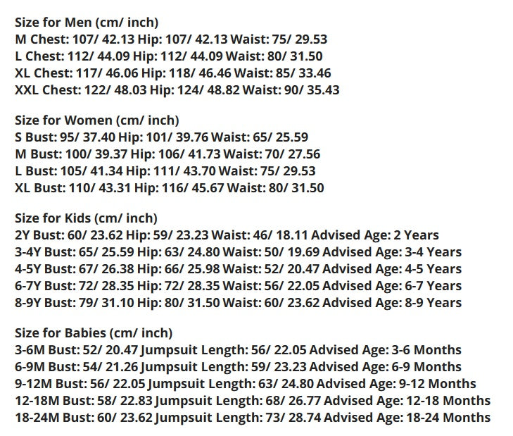 Suitable height: Baby: 3-6M, baby: 6-9M, baby: 9-12M, baby: 12-18m, baby: 18-24m, child: 2Y, child: 3-4Y, child: 4-5Y, child: 6-7Y, children: 8-9Y, women's clothing: S, women's clothing: M, women's clothing: L, women's clothing: XL, men's clothing: M, men's clothing: L, men's clothing: XL, men's clothing: XXL