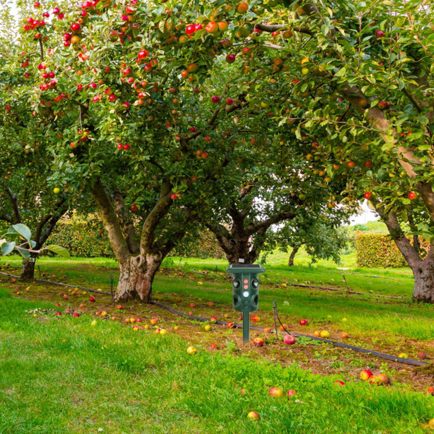 - *Solar & USB Rechargeable Animal Chaser*: Built in 3Pcs AA rechargeable batteries with total 2400mAh capacity and designed with DC charging port,the animal chaser can use about 7-10 days working time after 3-4 hours of USB fully charging. Top solar panel allows it to be recharged during use under sunlight in day time,able to prolong its daily working time.