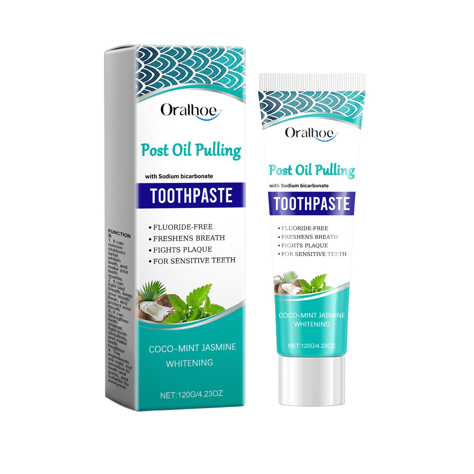 Ingredients: coconut oil, mint extract, cocoa extract, jasmine extract, sodium bicarbonate (baking soda)